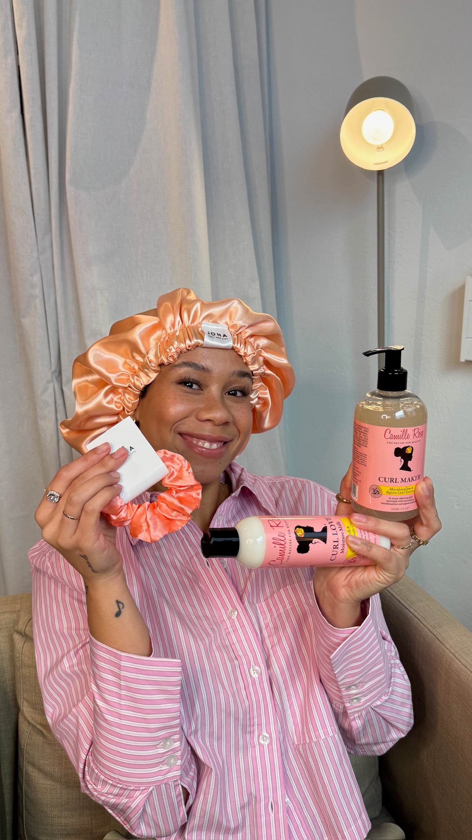 Die Satin-Cap in zarter Apricot-Nuance schützt Deine Haare beim Schlafen vor Frizz und Haarbruch, egal ob Du glattes, welliges, groß oder klein gelockiges Haar hast. Der Satin-Scrunchie hält Deine Haare schonend zusammen und ist für alle Haartypen geeignet, von feinem bis dickem Haar.